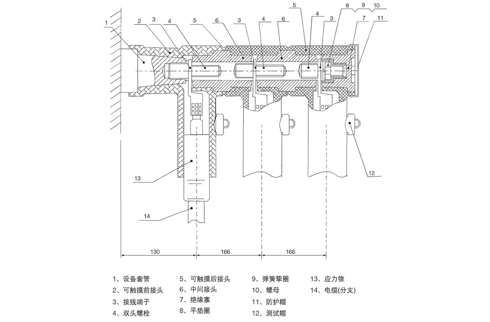 采用進(jìn)口優(yōu)質(zhì)絕緣橡膠全自動(dòng)注射而成,內(nèi)外層均為半導(dǎo)體屏蔽層,內(nèi)層用來(lái)均衡內(nèi)部電場(chǎng),外屏蔽層接地保護(hù)電纜頭表面零電位。應(yīng)力錐下端內(nèi)層與電纜的半導(dǎo)體層緊密接觸,而外半導(dǎo)體層又與電纜頭外半導(dǎo)體層緊密接觸,并通過(guò)電纜頭的接地孔接地,這樣不僅解決了電纜外屏蔽層切斷處的電場(chǎng)集中問(wèn)題,而且使電纜外屏蔽層保持零電位,保證人身安全??捎|摸電纜前接頭直接安裝在設(shè)備套管上,其后可與可觸摸電纜后接頭連接,組成多路出線,也可與避雷器連接,為電網(wǎng)提供過(guò)電壓保護(hù)。